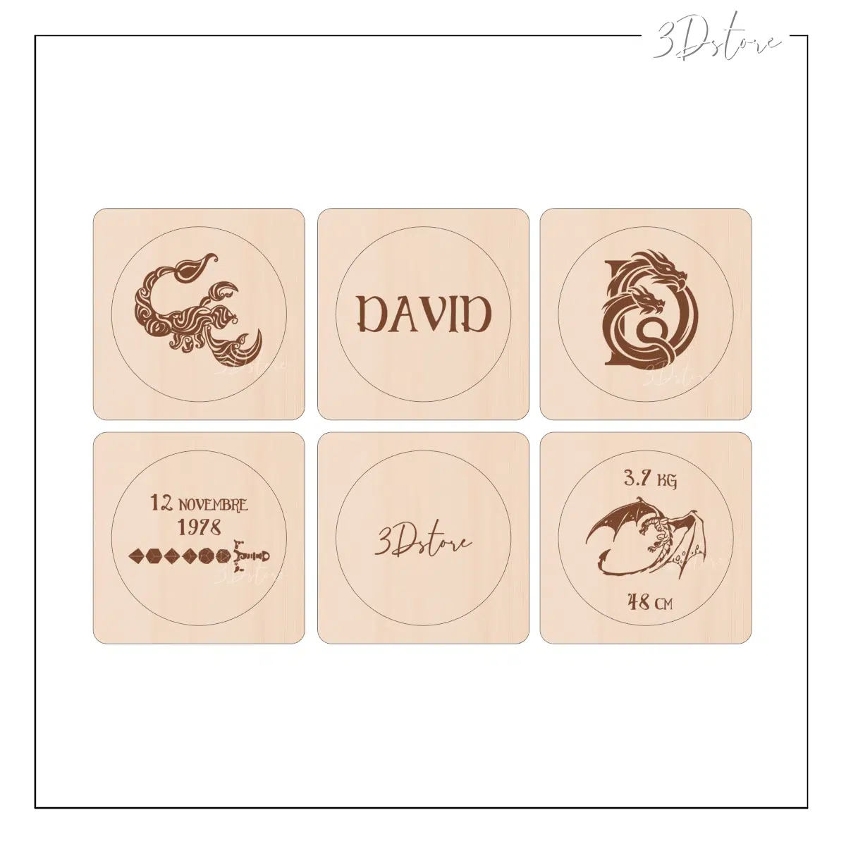 Ce dé raconte une histoire : celle d’une naissance, d’un prénom gravé pour toujours, et d’un dragon qui veille sur l’enfant. Symbole de force et de protection, le dragon apporte une touche poétique et originale. Ce motif attire l’œil tout en restant élégant, parfait pour embellir une chambre de bébé ou compléter un univers décoratif tendre et chaleureux.