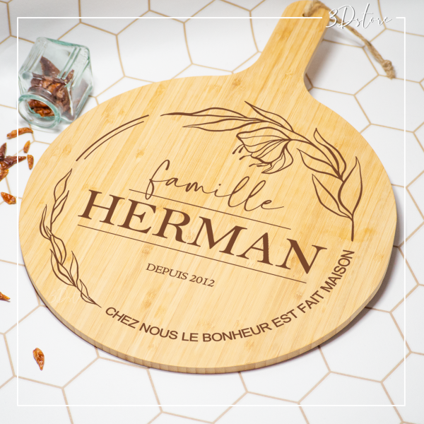 Personnalisez cette planche de service avec le nom de votre famille, l’année mais également une phrase importante pour votre famille.
